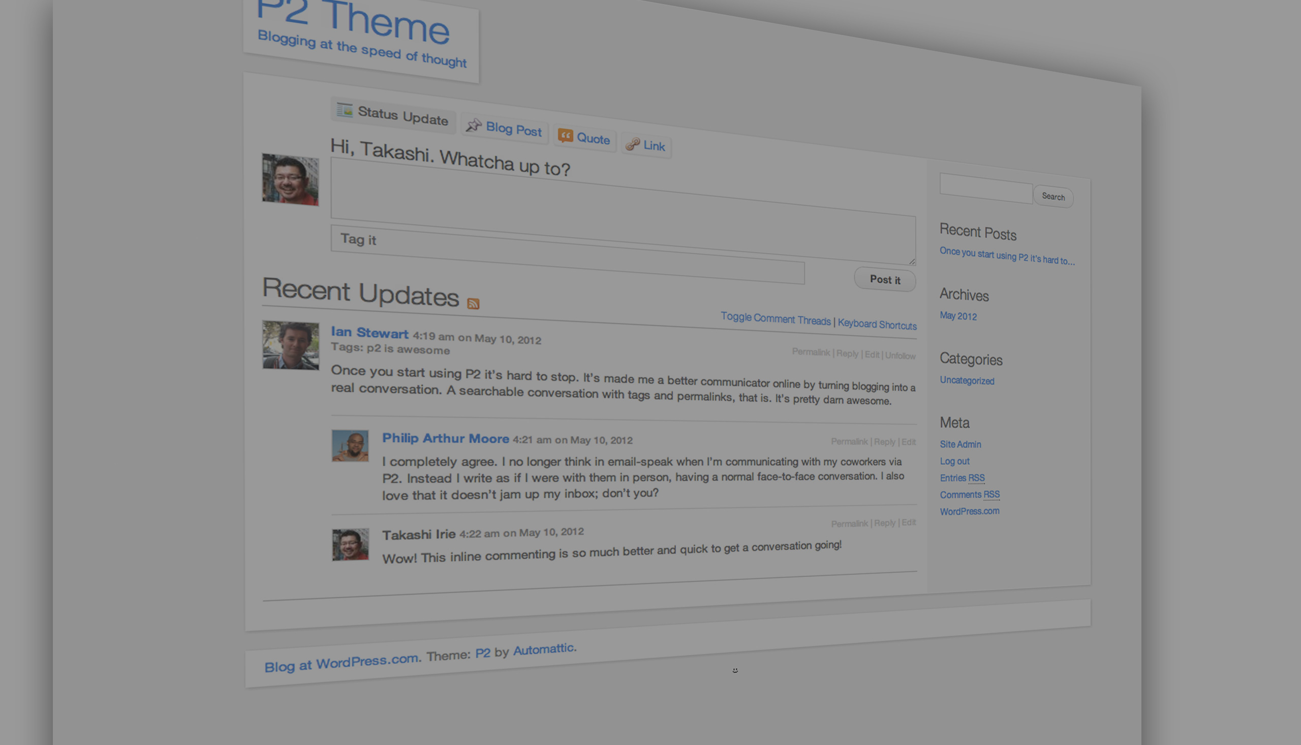 P2 is a theme for WordPress that transforms a mild-mannered blog into a super-blog with features like inline comments, a posting form right on the homepage, inline editing of posts and comments, real-time updates, and much more.